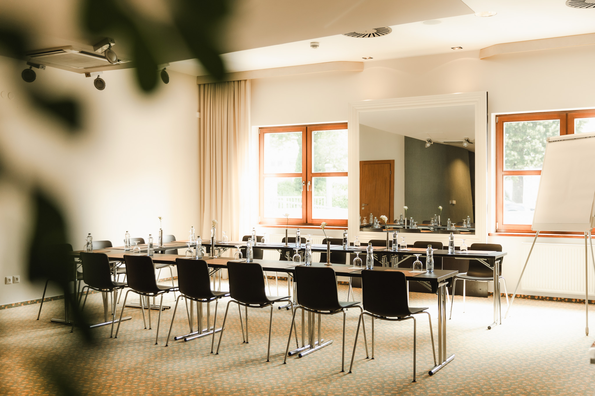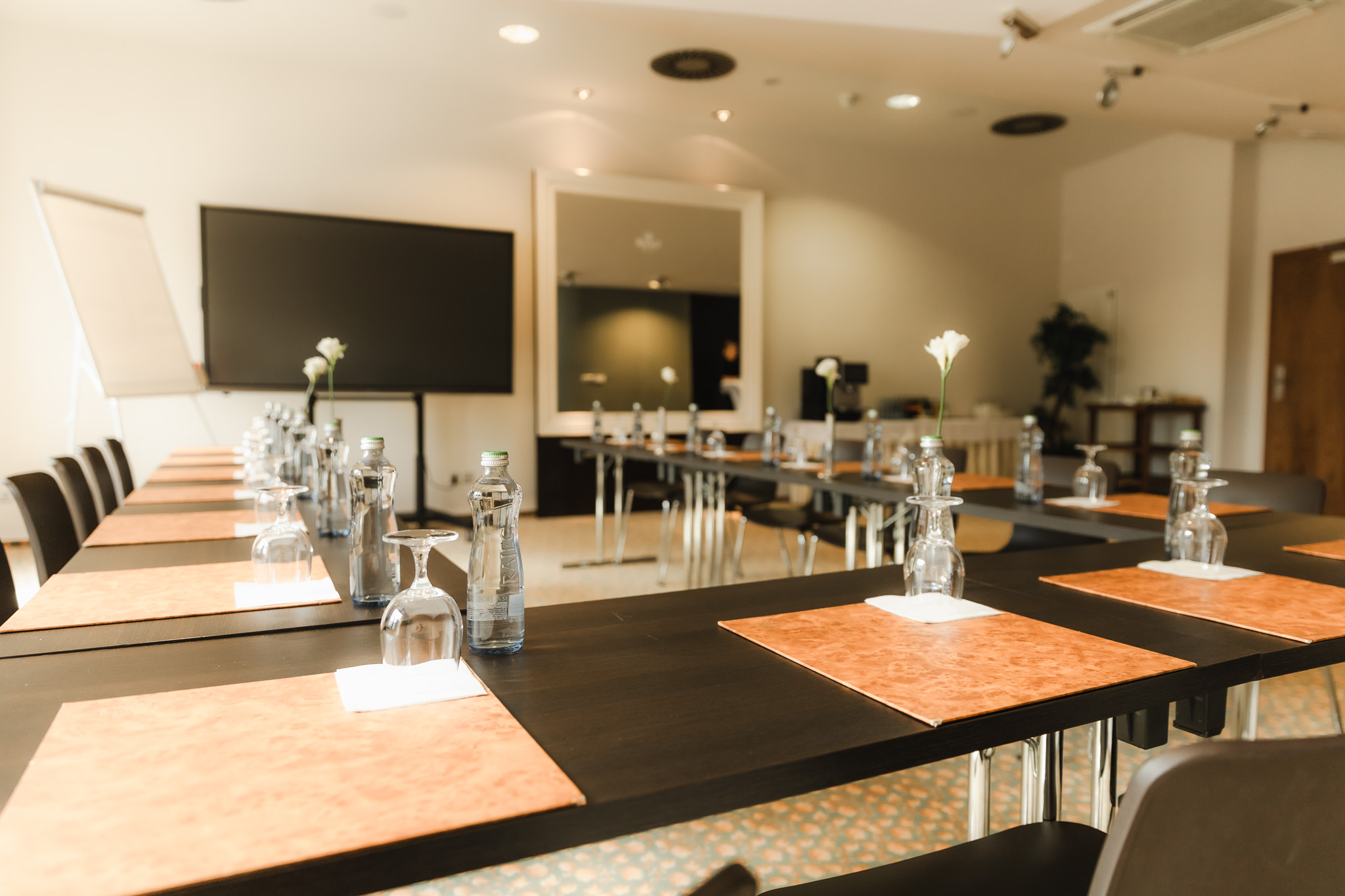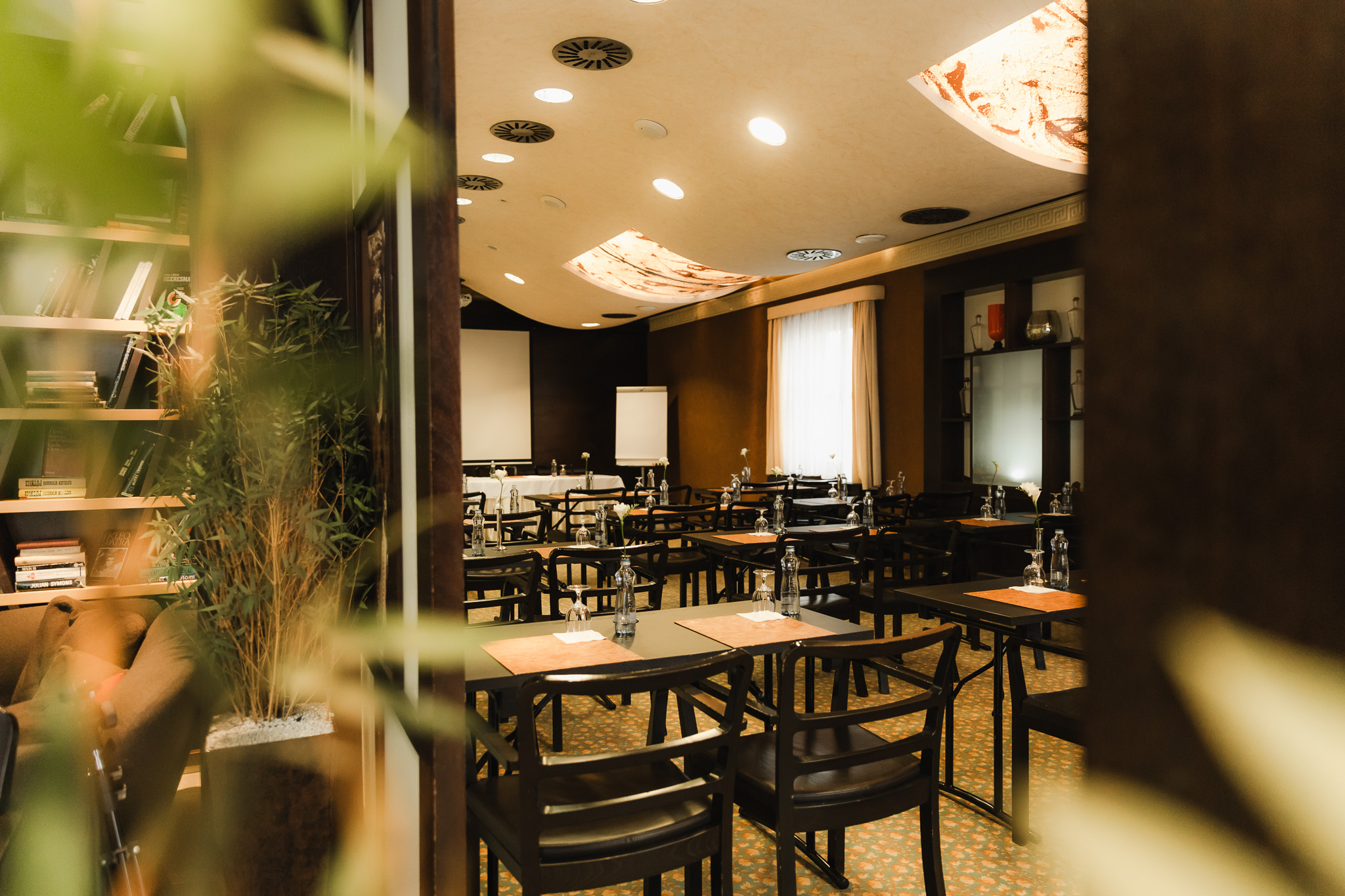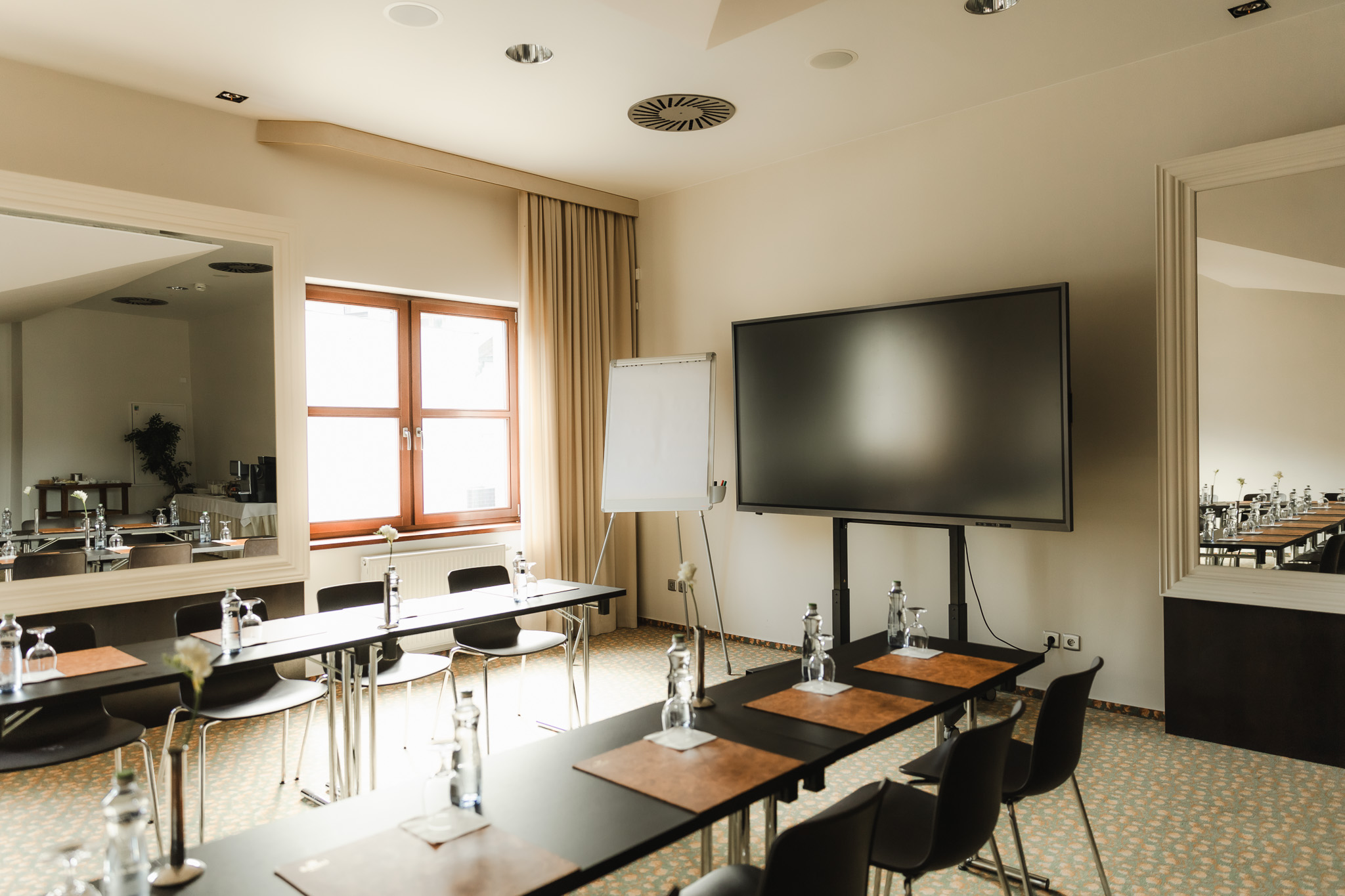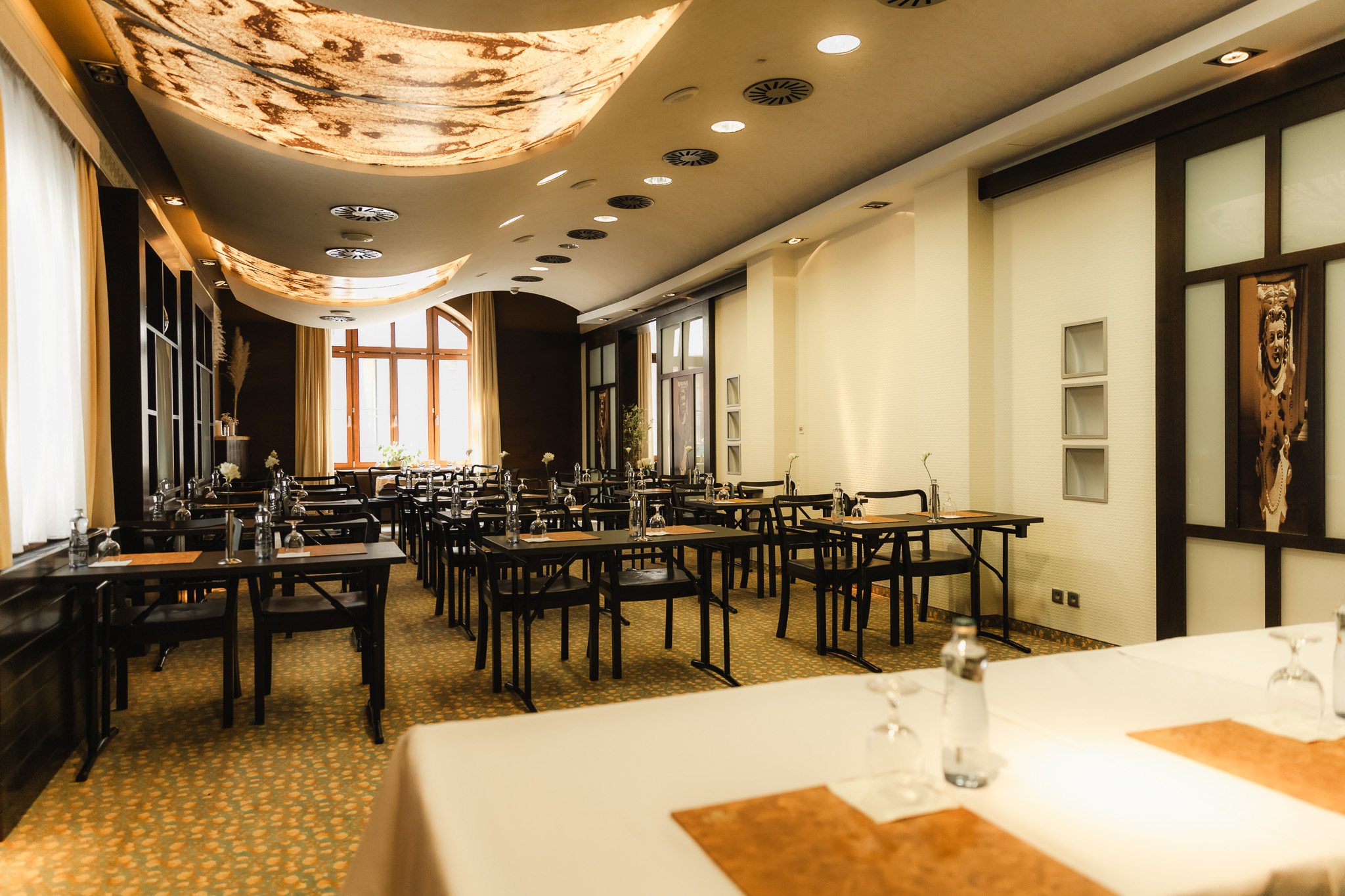 The Cabinet lounge is located next to the restaurant. It is equipped with a large oval table, which is suitable for smaller groups of up to 18 people. Daylight is provided by two windows from the yard.